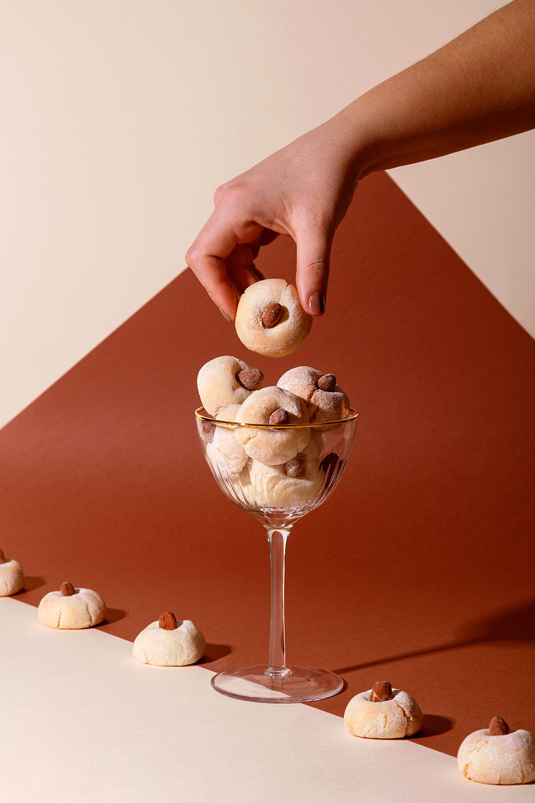 Pasticcini di pasta di mandorla, ricoperti con zucchero a velo e decorati con mandorle intere tostate. Un delicato attimo di dolcezza.